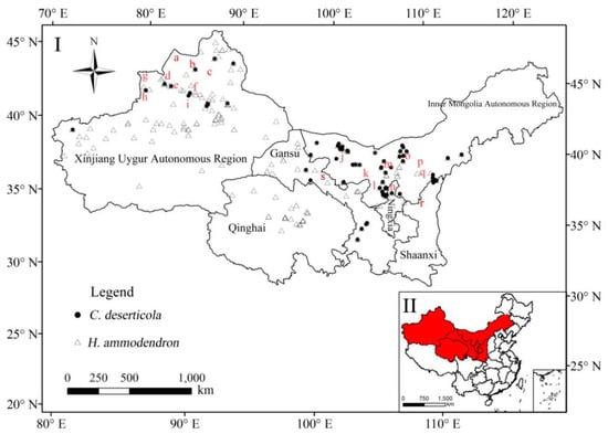 Geographic locations of C. deserticola and H. ammodendron, the black dots are the sampling points of C. deserticola, and the triangles are H. ammodendron. (I) study area; (II) study area in China. The red letters represent the counties and topographical units involved in study area. (a) Tacheng City; (b) Junggar Basin; (c) Hoboksar; Tacheng City; (d) Alashankou city; (e) Wusu city; (f) Shawan county; (g) Wenquan County; (h) Huocheng County; (i) Tianshan Mountains; (j) Badain Jaran Desert; (k) Alxa League; (l) Tengger Desert; (m) Hetao Plain; (n) Ningxia Plain; (o) Bayan Nur; (p) Baotou city; (q) Ordos city; (r) Mu Us Desert; (s) Hexi Corridor.