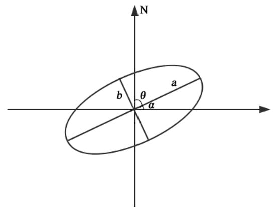 (3) Rotation angle (θ): it refers to the angle of the north and the major axis of the ellipse (Figure 3), which is used to indicate the distribution direction of elements in the main trend (Equations (4)–(8)). In this paper, we judge the spatial pattern according to the angle α (Figure 3). According to the 16-azimuth diagram [61,62], if α less than 11.25°, we define the spatial pattern as the east–west pattern, if greater than 11.25°, it is the northeast-southwest pattern.