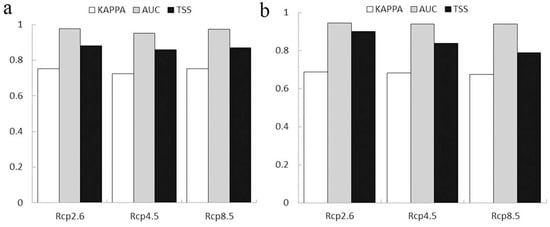 Results showed that AUC and TSS were relatively stable among the three evaluation indexes, and there was no significant difference in the evaluation indexes under three RCPs. Under the three RCPs in 2050s, the average values of the AUC, TSS, and KAPPA were 0.967, 0.870, and 0.744 respectively. The evaluation grades of the AUC and TSS are better than KAPPA (Figure 4a). In the 2070s, the average statistical value of the three evaluation indexes is lower than those in 2050s, namely, AUC was 0.942, TSS was 0.843, and KAPPA was 0.682. However, the evaluation grade of the model was the same as that of 2050s (Figure 4b).