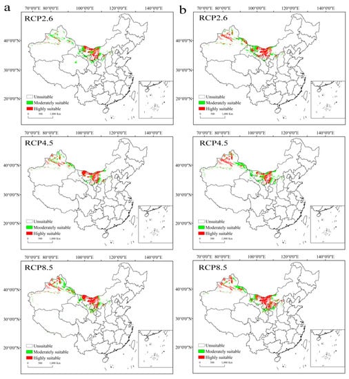 Comprehensive habitat suitability of C. deserticola under different RCPs in 2050s (a), and 2070s (b).