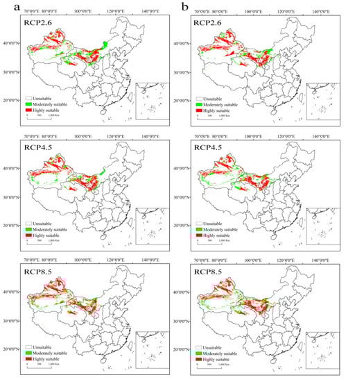 Comprehensive habitat suitability of H. ammodendron under different RCPs in 2050s (a), and 2070s (b).