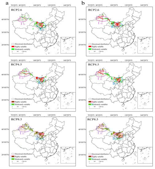 Based on the comparison of the SDE parameters of the part I and part II under three RCPs, we studied the spatial distribution pattern of the C. deserticola in 2050s and 2070s. In 2050s, the SDEx, SDEy, and rotation angle increased gradually with the increase of RCP in part I (Table 3). This increasing trend indicated that the distribution of C. deserticola in the main direction and second direction will disperse gradually, the main direction of the distribution presents east–west pattern. The greater the ellipticity, the more dispersed the distribution. The ellipticity of part I was I21 (0.942) > I31 (0.941) > I21 (0.937) (Table 3), the distribution of C. deserticola was the most dispersed under RCP4.5 (Figure 8, I21). In part II, the ellipticity was II21 (0.968) > II11 (0.899) > II31 (0.757), the distribution of C. deserticola was more dispersed with increasing concentration path, and the main distribution direction presents northwest–southeast pattern (Figure 7a, II).