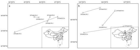 The centroid was calculated by using the module of mean center in ArcGIS toolbox to get the longitude and latitude of under three RCPs, and the centroid migration route from the 2050s to 2070s was mapped (Figure 8). The results showed that geographical habitat of species is moving towards higher latitude during the process of climate warming, as global climate change has caused the temperature to rise, the temperature zone to move north, and precipitation to increase. Specifically, in part I, the overall centroid distribution of C. deserticola showed a trend of migration northward over time. The migration pathway angle under RCP2.6 and RCP8.5 was greater than 11.25°, showing a trend of northeast migration. The angle of migration pathway was greater than 90° under RCP4.5, with a tendency to the northwest (Figure 8a). As for part II, the angle of centroid migration pathway was less than 11.25° under RCP2.6, with a trend of eastward migration. With the increase of RCPs, the distribution of centroid gradually would move northwest (Figure 8b). Hence, our results were consistent with the previous studies [66,67].