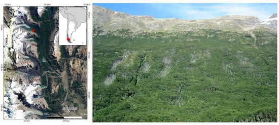 Study site location (left) and photo of the studied forest (right) in the Toro River Valley, Santa Cruz, Argentina.