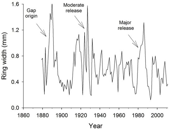 Gap origin events were defined based on the detection of rapid early growth rates of the trees [10,12]. This method uses a radial growth threshold based on the last ten years (extent) of a-priori field-determined groups of suppressed and dominant trees. The threshold for gap origin trees is set as the upper 95th percentile of growth rate of suppressed trees over the last ten years which corresponded closely with the fifth percentile of dominant trees [10,12]. The threshold was 0.96 mm and consequently trees that had rings 6 to 15 (counted from the pith) present (87.8% of the sampled trees) and grew at a higher rate than the threshold between those years (6–15) were considered of gap origin. Visual examination of the individual tree-ring series was used to confirm radial growth threshold and extent on gap origin trees. Establishment dates for gap origin trees were determined to depict gap origin disturbance events [10,44].