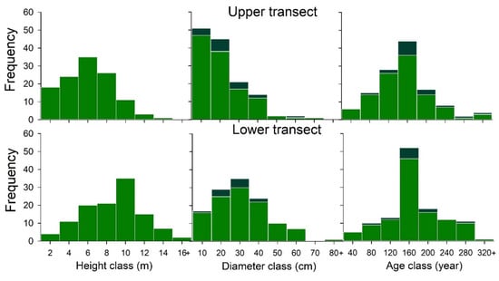 The structure of the forest exhibited differences along with changes in the elevation (Table 1). Living trees in the lower transect were significantly taller than those of the upper transect (t-value = 7.62; p < 0.012) and had a similar height class distribution but with different mode (Figure 2). Likewise, living and dead trees in the lower transect were significantly larger than those of the upper transect (t-value = 5.47; p < 0.001) but presented different diameter class distribution (Figure 3). While the average tree age in the lower transect was higher, the difference was not significant (t-value = 1.85; p = 0.06; Table 1).