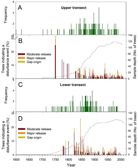 Disturbance chronologies for each transect were built by determining the proportion of trees with major and moderate releases and gap origin events relative to the number of trees alive [10,12,36].