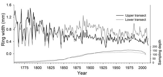 The average radial growth of trees was 0.62 and 0.69 mm/year for the upper and lower transect, respectively, and did not differ significantly (t-value = 1.66; p = 0.07). The radial growth patterns, however, presented distinct patterns (Figure 5). Given the low sample size both chronologies were characterized by high variability during the first 60 years. Starting in 1850, the lower transect chronology exhibited higher values than the upper transect with accentuated differences during some periods (1870–1885, 1890–1930, 1985–2005; Figure 5).