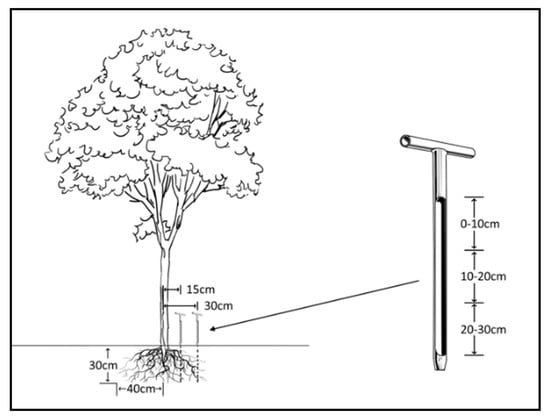 Fine root coring campaigns were launched for all trees in May, September, and November, i.e., at the beginning, middle, and end of the growing season. Due to the homogenous edaphic and climatic conditions in the nursery, we hypothesized that all the trees of the two cultivars had a similar growth condition. A pre-test coring campaign showed that the range of the root system was similar to a cylinder with a 70-cm diameter and 35-cm height. Therefore, during every coring campaign, four soil cores were collected for every individual tree, two at a distance of 15 cm to the trunk and the other two at a distance of 30 cm, i.e., the inner and outer fine roots. The soil was sampled down to a 30-cm soil depth using a soil auger with 30-cm length and 3-cm radius. Each sample was divided into three horizons: 0–10, 10–20, and 20–30 cm soil depth, i.e., the upper, middle, and lowest layers (Figure 2). Fine roots (<2 mm) were filtered using sieves (2-mm mesh size) and separated by forceps in the laboratory. Then, the samples were carefully washed and dried in the oven at 65 °C for 72 h. Finally, all the samples were weighed using a balance with an accuracy of four decimal digits to obtain the dry weight. Fine root biomass at different depths was calculated using the dry weight divided by the cross area of the auger.