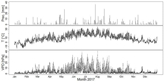 Daily amount of precipitation (Prec.; mm), temperature (T; °C), and the vapor pressure deficit (VPD; hPa) at the site for the year 2017.