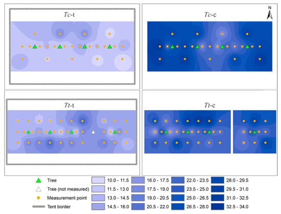 Maps (interpolated values) of the volumetric soil water contents (Vol.-%; VWC) at a soil depth of 10 cm averaged over four measurement days in summer 2017 and collected at defined distances from the study trees. The rooting zones of the tree individuals in the respective left graphics were covered by the rainfall exclusion constructions (‘drought treatment’, Tc-t and Tt-t), whereas the individuals in the right images belonged to the control groups (‘control’, Tc-c and Tt-c).