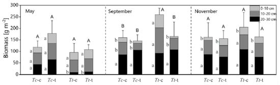 Fine root biomass (g m−2) for the 0–10, 10–20, and 20–30 cm layers of the control and treatment groups of T. cordata and T. tomentosa during May, September, and November 2017. The different letters indicate significant differences (p < 0.05) between cultivars and treatments for the overall biomass (capital letters) and different layers (lowercase letters).