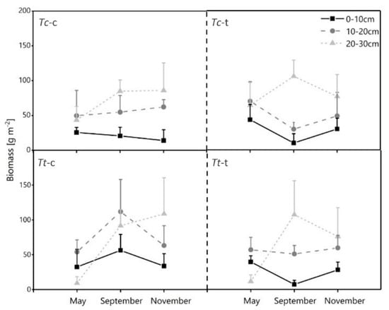 For T. tomentosa, Tt-c continued growing in the 20–30 cm layer while the fine roots from the 0–10 and 10–20 cm layers decreased by 40.3% and 43.4%, respectively. For Tt-t, the fine root biomass in the three layers developed significantly differently from Tt-c during the whole period (p = 0.039). In 0–10 cm depth the fine root biomass decreased from 39.5 to 7.3 g m−2 during the first four months and increased to 28.2 g m−2 during the last three months. The fine roots in the 10–20 cm layer showed only slight fluctuations for the whole period. The fine root biomass in the deep layer was initially very low (11.6 g m−2) and steeply increased to 107.4 g m−2 by September. In contrast, the same layer in the control group decreased by 29.3%.