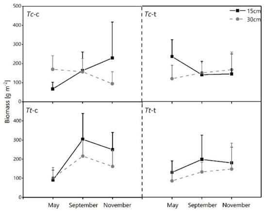 The horizontal development of fine roots of the two cultivars was different when exposed to drought (p < 0.05) (Figure 8). The fine root biomass of Tc-c steadily increased at a distance of 15 cm from the stem, whereas it decreased at a distance of 30 cm from May to November. Tc-t decreased its fine root biomass at a distance of 15 cm from 235.7 to 140.7 g m−2 from May to September, whereas the biomass at a distance of 30 cm slightly increased over measurement time.