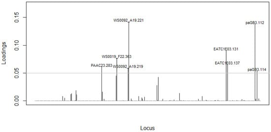 Contribution of individual SSR loci to overall genetic clustering (loci above the threshold t = 0.05 are labeled)
