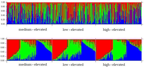 Bar plot analysis in the software STRUCTURE (K = 3). The probability of individuals are clustered into three populations. Top: individuals sorted in the original order; bottom: individuals within each population sorted by the estimated membership coefficient Q. Each individual corresponds to a colored column.