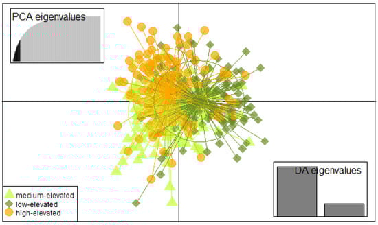 The interpopulation variability among ecotypic groups was inspected by standard indexes of genetic diversity (Table 4). The mean number of alleles (Na) was closely similar between low-elevation (13.813) and high-elevation ecotypes (13.125), whereas in the medium-elevation ecotype, the mean number of alleles was higher (15.625). The number of effective alleles (Ne) varied between 5.594 for the high-elevation ecotype to 6.249 for the low-elevation ecotype. The mean value across all populations was estimated as Ne = 5.984, with an SE of 1.279. The mean values of population genetic diversity according to Shannon’s information index (I) ranged from 1.730 to 1.803. The fixation indexes for all ecotypes were positive, ranging from 0.128 to 0.175; this indicated a heterozygote deficiency, which is probably attributable to an occurrence of null alleles at several loci (Table 3). Also, the values of expected heterozygosity being exceeded for all ecotypic groups (LE: 0.715, ME: 0.701, HE: 0.698) showed heterozygosity (LE: 0.609, ME: 0.599, HE: 0.596).