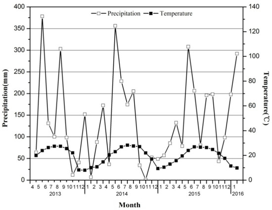 This study was performed in the town of HeTian, southeast of ChangTing County, Fujian province, China (25°33′–25°48′ N, 116°18′–116°31′ E, 310 m above sea level), which experiences some of the most serious soil erosion in the Fujian province [38]. The main soil type is red soil, which is characterized as nutrient-poor with coarse grain granite parent material. Most of the soil is exposed core, or even bedrock. Because of soil depletion, shrub and grass vegetation is scarce, and the dominant plant species are P. massoniana, Dicranopteris dichotoma (Thunb) Berhn [39]. The integrated mean concentrations of C, N, P, and K in soil (0–30 cm) were 1.06 mg·g−1, 0.15 mg·g−1, 0.017 mg·g−1, and 4.26 mg·g−1, respectively. The study site belongs to subtropical monsoon climate with the wet seasons typically from March to September and the dry seasons generally from October to February. The study area experienced a mean annual rainfall of 1696 mm in the study period, and a mean annual temperature of 19.85 °C, with the variation range from −7.8 °C to 39.8 °C. Temperature, soil moisture, precipitation, and relative humidity were recorded every 15 min from the installed automatic weather station (Monitor Automatic Weather Station, ICT, NSW, Australia) at the study site (Figure 2). We used the linear relationship of precipitation and temperature to define aridity conditions. The climate was classified as drought when the temperature was 2-fold greater than the precipitation [40]. The calculated results in Figure 2 show that the arid climate happened when the precipitation point was lower than the temperature. As a result, arid conditions occurred for six months between April 2013 and January 2016: October 2013, January 2014, April 2014, September 2014, October 2014, and October 2015. Hence, we concluded that the study site was not arid, so it was used as a control area.