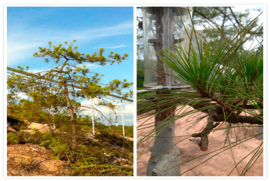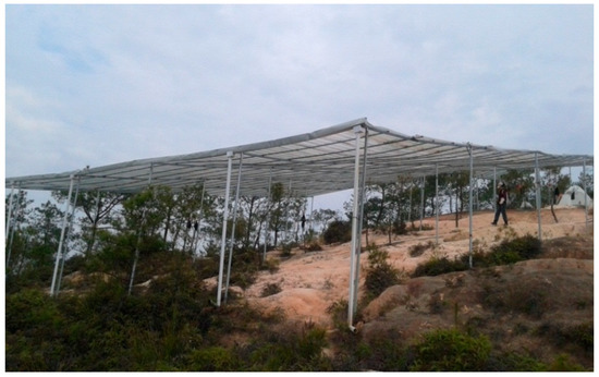 The experimental setting involved a three-year experiment of 100% rainfall exclusion. Starting in April 2013, four plots (each 20 × 20 m) of mature P. massoniana were established, on a slope of 30° at 333 m above sea level, facing southwest. In each sample plot, there were 10 or 11 mature P. massoniana individuals, which had been sown by plane in 1998. The mean diameter at breast height (DBH) of P. massoniana was 4.2 cm, tree height was 2.4 m, and blade length was 8.5 cm (Figure 3). To avoid the impact of rainwater runoff on sampling, two plots (one upslope and one downslope) subject to 100% rainfall exclusion as the drought plot, and the other two were influenced by the rainfall events (Figure 4). In the drought plots, a 4 m transparent wave tile coated with UV paint (light transmittance 90%) was fixed above the canopy. To channel the rainfall flow down the slope, wave tiles were installed parallel to the terrain. Polyvinyl chloride (PVC) strips did not have any effects on ambient temperature and humidity. A ditch 80 cm in depth was dug along the top edge of the drought plots to intercept up-slope runoff, which was channeled to the bottom edge. The remaining plots received no manipulation.