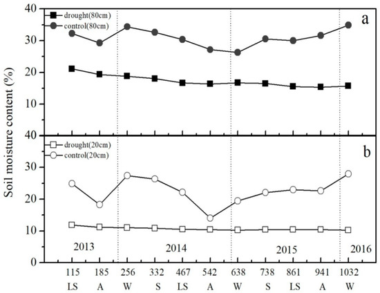 Relativechanges in soil moisture content across the study period (from April 2013 to January 2016) in the control and drought plots. Samples were collected in later summer (LS), autumn (A), winter (W), and late spring (S). (a) Soil moisture content at 80 cm in the control and drought plots; (b) Soil moisture content at 20 cm in the control and drought plots.