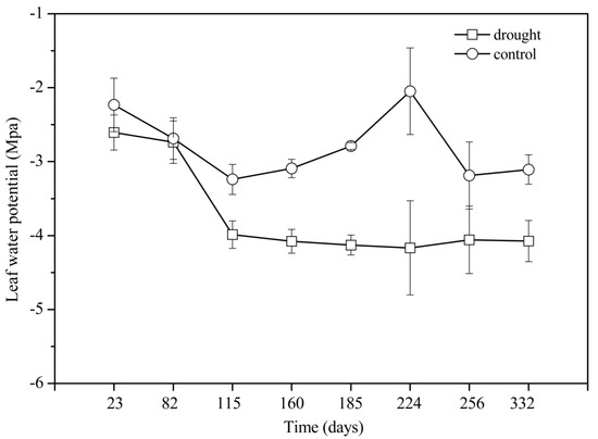 The relationship between N and P concentrations in plants was determined by soil nutrient conditions and the plasticity of the plants [58]. Many studies generally reported that the leaf N:P ratio could be used as an indicator of soil nutrient deficit; N:P < 14 or N:P > 16 were used to indicate N restrictions or P restrictions, respectively [23,56,59]. However, these results were more common in humid areas. These results areas where water is severely deficient are lacking [60]. Our sample plot had red soil that differentially develops from coarse grain granite and characterized by poor nutrient levels and lack of water, which reduce the availability of N and P in the soil [60]. Our results confirm this conclusion. The average concentration of leaf N in the control group was 9.87 ± 1.35 mg·g−1, and the leaf P concentration was 0.65 ± 0.063 mg·g−1. Both were significantly lower than for terrestrial plants globally (N: 20.1 ± 8.7 mg·g−1, P: 1.8 ± 1.1 mg·g−1) [15,23]. Because the decrease in soil moisture limits the process of organic matter production and mineralization, the release of P from parent material slowed down, soil organic matter concentration reduced, which was consistent with the availability of N [61]. When the concentration of leaf P decreased more than that of leaf N concentration in the drought group, the average N:P value was 15.73 ±3.31, which is significantly higher than that of terrestrial plants globally and, similar to that of desert plants in China [62,63]. Plant P concentrations were closely related to soil P concentration. The concentration of soil P in most parts of China [53] is lower than the global level, which directly affects the P absorbed by plants.