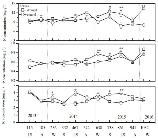 Leaf elemental concentrations of N, P, and K in P. massoniana under control and drought treatments (mean ± SD). Samples were selected in late summer (LS), autumn (A), winter (W), and late spring (S) from 2013 to 2016. Different letters indicate significant differences between the control and drought plots; **p < 0.01, * p < 0.05.
