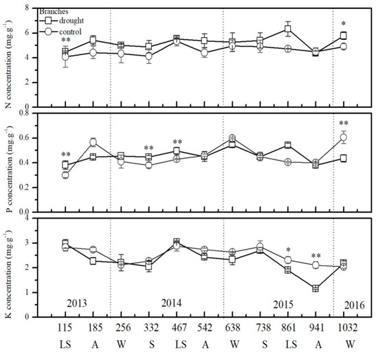 Branch elemental concentrations of N, P, and K in P. massoniana under control and drought treatments (mean ± SD). Samples were selected in late summer (LS), autumn (A), winter (W), and late spring (S) from 2013 to 2016. Different letters indicate significant differences between the control and the drought plots; ** p < 0.01, * p< 0.05.