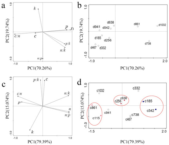 Principal component analysis (PCA) with leaf element concentrations and ratios as variables, and the corresponding variable distribution in (a) and (b) the drought group and (c) and (d) the control group. The significant differences among scores of different sample times are depicted along the PC axes. Note: d256 = day 256 in the drought group; c256 = day 256 in the control group.