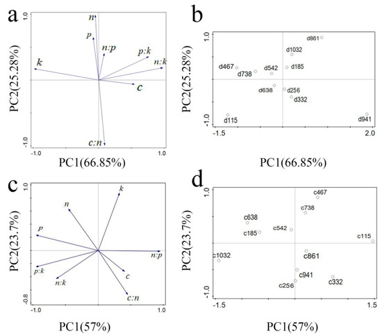PCA with branch element concentrations and ratios as variables, and the corresponding variable distribution in (a) and (b) the drought group and (c) and (d) the control group. The significant differences among scores of different sample times are depicted along the PC axes. Note: d256 = day 256 in the drought group; c256 = day 256 in the control group.