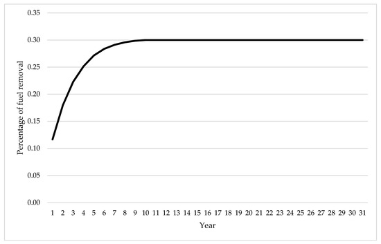 The periodic maintenance () of the stand is assumed to be $10 per acre, consistent with Daigneault, Miranda, and Sohngen [20] and Bair and Alig [21]. The cost of establishing new forest after a wildfire, is assumed to be $122.4 per acre, is based on Amacher, Malik, and Haight [11] using the derived optimal planting density and Dubois et al. [22]. Intermediate treatment cost varies by the level of fuel removal. Consistent with Amacher, Malik, and Haight [11], the cost function of intermediate actions is assumed to be a linear function of fuel removal efforts.