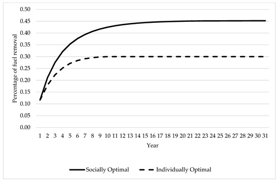 In order to derive the social costs associated with individually managing a forest and in the presence of fire externality, we assume that both adjacent parcels are jointly managed by a social planner who simultaneously maximizes joint net returns to both parcels and who is fully informed about fire spillover effects. Socially optimal steady-state fuel treatment is found to be 45.20% of fuel biomass present and the associated social site value is $293.30 per acre. For a better understanding of the wedge between socially and individually optimal fuel treatment paths, Figure 2 illustrates socially and individually optimal decision paths in the case of fully informed landowners. In this case, the socially optimal level is higher than the individually optimal by about 14.39%.