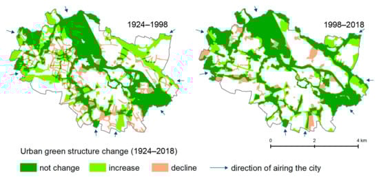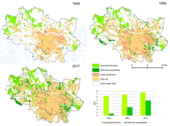 Our study has indicated a growth in the percentage of urban forests in the years 1944–2017, which is characteristic of all Polish cities and a result of the implementation of a programme to increase forest areas []. This positive trend has also been helped by the fact that only very few municipalities have decided to reduce forest land in their resources []. The percentage of forests that we have calculated (12.5%) is higher than that given in the official local databases (7.6%), which is a result of the fact that they ignore informal woodlands and plantings, which amount to 4.9% of the city’s area.