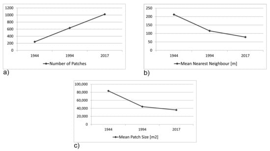 Development expansion has brought about a discernible reduction in the distance between buildings and forest patches. In 1944, the average distance between forests and buildings amounted to 269 m, by 1994 it dropped to 151 m, and by 2017 to 80 m. Until 1944, small and large forest forms constituted accordingly 91% and 9% of all forest areas. After 1944, the ratio of large and small forest patches was subject to considerable changes: In 1994, large forest complexes constituted 72%, and small forest patches—28% of all forest areas, while by 2017, the percentage of large complexes fell to 61%, and small forest patches rose to 39%. The forest fragmentation process is confirmed by the landscape indicators, which show that in the years 1944–2017, the number of forest patches increased (from 242 to 1021), with a simultaneous decrease in the average patch area (from 83,420 to 3592 m2) and the in distance between them (from 212 to 80 m) (Figure 2).