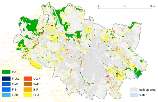 Analysis of the land cover transition in the entire period under study (Table 3, Figure 3) has indicated that the positive forest area balance is made up both by the establishment of new forests (226 ha) and transformation of the existing forest areas into other land cover forms (1854 ha). New woodlots and forests have been primarily created on open land (86%, 5.5% of the city’s area), and to a lesser extent, on built-up areas (6%), usually on post-industrial land and along railway lines, on land previously occupied by parks (5%), in former workings and filled-up riverbeds (3%). Interestingly enough, more often than not, forest areas transformed into open land 71%, 0.6% of the city’s area), and, less frequently, into built-up areas (12%), green areas (12%), or waters (5%). The longest-lasting forest forms are forest complexes on the city’s outskirts, which constitute nearly half of all forests.