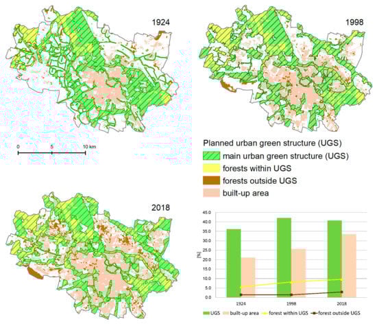 In the plans, there is the following forest area per 1 ha of the planned built-up area: 1924—0.27 ha, 1998—0.32 ha, 2018—0.29 ha. However, it should be pointed out that the built-up area assumed for the 2018 plan has probably been exceeded already.