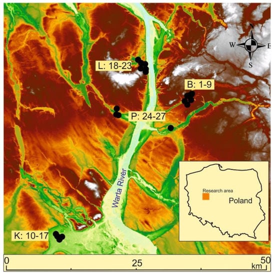 The study was conducted in July and August 2016 in the Babki, Konstantynowo, and Łopuchówko forest districts in the Wielkopolska Region (western Poland). The average annual rainfall recorded at the meteorological station at Zielonka (17°6’25” E, 52°33’18” N) was 525 mm for the years 1986–2008. Although the trend line for precipitation is relatively constant, the annual sum of rainfall differed significantly in individual years (from 312 mm in 1989 to 724 mm in 1993). The average annual air temperature was 8.3 °C []. The vegetation period lasts 220–230 days []. The landscape is shaped mostly by glacial and postglacial formations affecting the soil properties and plant species composition []. Within our study plots, we described a few groups of soils: Phaeozems, Umbrisols, Luvisols, Gleyosols, Cambisols, and Arenosols (Table 1). Such environmental conditions affect the proportion of ash in the stand species composition. In the studied area, ash is an important forest-forming component of mixed stands along the river valleys and lakesides (Figure 1). It grows in riparian forests as the dominant and co-dominant species. Its occurrence within such sites is associated in various proportions with Alnus glutinosa Gaertn., Ulmus laevis Pall., U. glabra Huds., or Quercus robur L. As an admixture, it grows additionally within moist and mesic broadleaved forests, with a higher proportion of Q. robur and Tilia cordata Mill. (Table 1). The study was carried out in 27 plots. The age of ash stands, according to forest management plans, ranged from 48 to 144 years (Table 1; Figure 1).