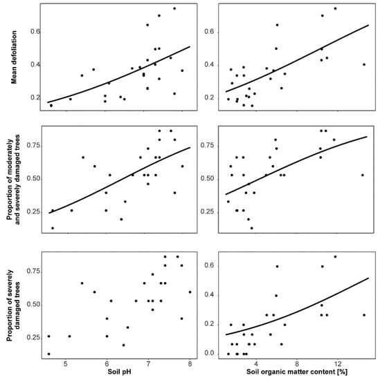 Relationships between soil pH (left side) and organic matter content (right side), and defoliation of Fraxinus excelsior (expressed as mean defoliation, proportion of moderately and severely damaged trees, and severely damaged trees only, based on 15 sample trees per study plot; upper, middle and lower rows, respectively), modeled using beta regression (Table 2 and Table 4, n = 27). In case of relationship between soil pH and proportion of severely damaged trees we did not draw line, as soil pH was not included in final model.