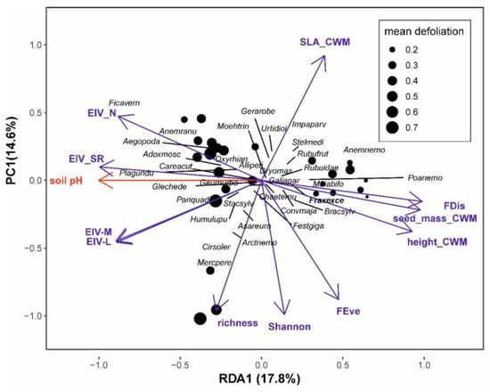 The analysis of understory vegetation species composition revealed that the RDA model constrained by the soil pH and mean defoliation was worse than the model with soil pH only (Table 5; Figure 3). This indicated that only soil pH drove species composition of vegetation. The main gradient revealed by the analysis (soil pH) was similar to the gradient of defoliation. Study plots divided the RDA space into three clusters: two of them grouped along the RDA1 axis, and a remote cluster of three plots at the bottom of the ordination space. The most numerous cluster in the left part of the RDA covered plots with higher mean defoliation, EIVs, positively correlated with soil pH. However, FDis, seed mass, and height CWMs, higher in the second cluster, were negatively correlated with soil pH. The bottom cluster was characterized by low values of SLA CWM and high species richness, as well as high EIVs of moisture and light.
