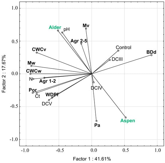 Diagram of principal component analysis (PCA) with projection of variables on a plane of the first and second factor for soil (Ct—total carbon content, N—nitrogen content, Por—porosity, Mv—soil moisture in volume percent, Mw—soil moisture in percent by weight, Pa—air capacity, BDd—“dry” bulk density, CWCw—field capacity in percent by weight, CWCv—field capacity in volume percent, WDPTf—water drop penetration time of fresh soils, Agr—aggregate distribution, DC III-V—different decay class).