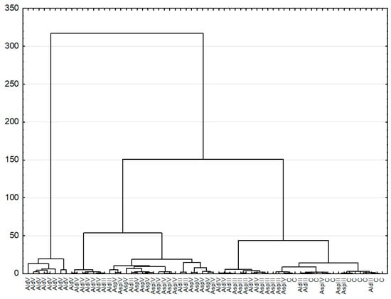 Dendrogram with group identified in the cluster analysis (Ald—alder, Asp—aspen, III-V—different decay class, C—control). Bulk density, porosity, moisture, capillary water capacity, aggregate distribution, and WDPT were used for dendrogram.