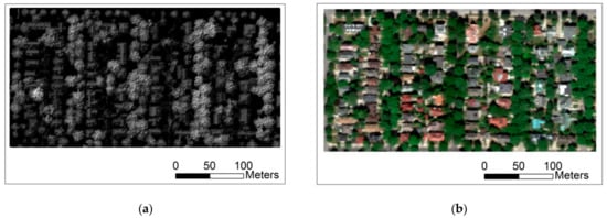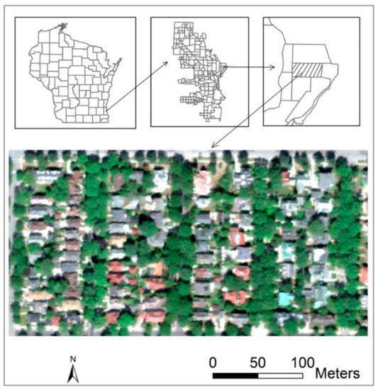 The case study was located in the neighborhood of Upper East Side, Milwaukee, Wisconsin, the United States (Figure 1). This is a residential neighborhood with four blocks between Lake Michigan to the east and the Milwaukee Rive to the west. This area is not only covered by relatively flat roads and lawns, but also by tall residential buildings, various deciduous and conifers trees, and shrubs, etc. Most buildings have smooth but sloping roofs while the canopy surfaces are irregular and rough. Crown sizes, tree heights, and crown shapes vary greatly, with the radius of the tree crown in the study area ranging from 2 to 15 m and tree heights from 3 to 25 m. Deciduous trees, such as ash (Fraxinus spp.), maples (Acer spp.), oak (Quercus spp.), and others, have large crowns, but the crown sizes of the coniferous trees, including pine (Pinus spp.) and spruce (Picea spp.), are relatively small.