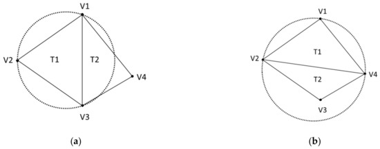 For points in a two-dimension plane, the fundamental criterion is the empty circumcircle. Any Delaunay triangulation ensures the circumcircle of a triangle contains no other points in its interior. The Delaunay and non-Delaunay triangulations for four points were compared in the following illustration (Figure 2). Connecting the four points, two irregular triangles can be created. If the circumcircle associated with T1 is empty, indicating no other points are in the circumcircle, this triangulation is a Delaunay triangulation. However, if the circumcircle associated with T1 contains V3 in its interior, this triangulation is not a Delaunay triangulation.