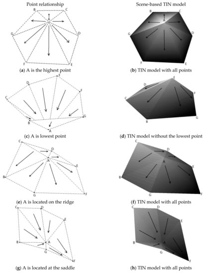 (4) Saddle shape: the points on both sides of the saddle are higher than the points in the middle of the saddle. If the center point of the saddle is greater than the value of either end of the saddle, the point is considered to be the connection point of the branches and remains as a key point to create the TIN model. Otherwise, the point is removed as a point penetrating the surface.