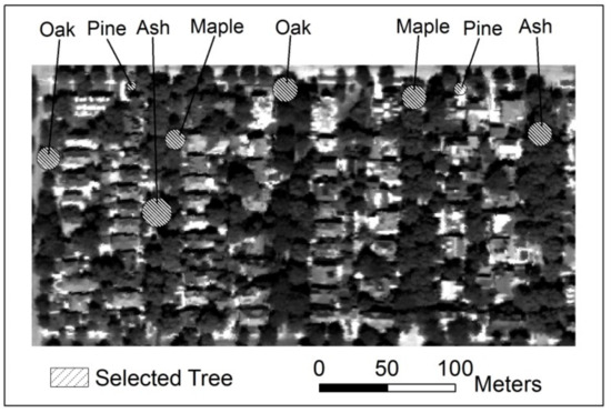 In order to observe the local performance of the model in detail, eight randomly selected individual trees, including two ash trees, two maple trees, two oak trees, and two pine trees, were examined (Figure 4). Ash, maple, and oak are deciduous trees with large crowns, but pine trees are coniferous trees with small crowns.