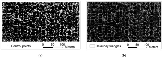 In addition to the advantages of producing a better model, the extraction of control points reduces the amount of data storage and differentiates the point density for target objects. Since some points covering trees were identified as penetrating points and deleted, only the points over the canopy surface were preserved as control points. Different from the penetration of LiDAR into trees, laser cannot penetrate building roofs, and thus most points, covering buildings, were preserved to model their gentle slopes. Compared to trees and sloping roofs, the surfaces of grass and the road are relatively flat, and a large number of points were deleted as local depressions and few points were defined as control points to create their flat surface models. The result is consistent with common sense that more points are needed in rugged areas and fewer points in relatively flat areas [31].