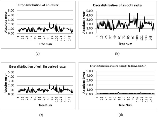 For the extracted 155 trees in the study area, statistical results indicate that the average error of the scene-based model is 0.18 m, with a standard deviation of 0.41, while the errors caused by the original raster, smoothed raster, and ori-TIN derived raster are 0.96, 2.05, and 1.00 m, with standard deviations of 1.61, 1.82, and 1.87, respectively (Table 1). With the scene-base model, the error mean is reduced by 81.25%, 91.22%, and 82% from those generated by the above three traditional models, and the fluctuation range of the errors has also become very narrow, which is only 18%, 10%, and 19% of error ranges caused by ori-raster, smooth raster, and ori-TIN derived raster (Figure 8). For the scene-based model, 69.03% of the trees are with an error less than 0.2 m, 27.74% are less than 0.3 m, and only 3.23% are between 0.3 and 0.51 m. In contrast, 99.35% of trees in original raster have the errors greater than 0.2 m, of which, 66.45% of trees are with errors ranging from 0.2 to 1.0 m, and 33.55% are greater than 1.0 m. The absolute errors from the original TIN model are from 0.1 to 2.2 m, which is similar to the error distribution of original raster. Although the low-pass filtering algorithm smooths the surfaces of the model, it produces relatively large errors. Especially, the percentage of points with errors greater than 1.0, 2.0, 3.0, and 4.0 m reach 13.55%, 37.42%, 43.87%, 5.16%, respectively. The error mean and its distribution indicate that the scene-based TIN is relatively stable in modeling forest canopies and is less affected by tree species or canopy morphologies.