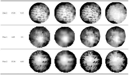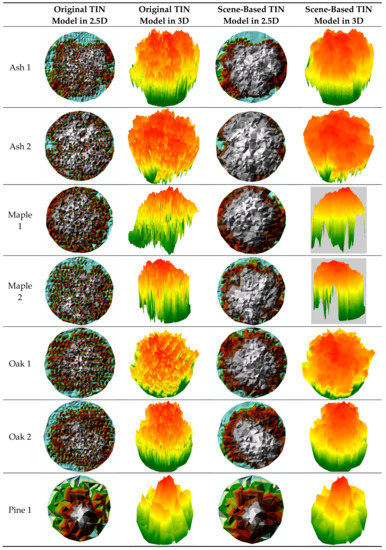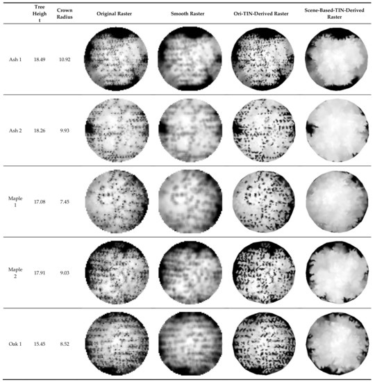 Scene-based TIN and ori-TIN models of the eight trees were also converted into grid images, and compared with original raster and low-pass filtered raster in 2D perspective (Figure 10). Similar to 2.5D and 3D images, large deciduous crowns, including ash, maple, and oak trees exhibit very distinct pit phenomena over both original and ori-TIN derived raster images, while small coniferous canopies, especially Pine 1, present relatively few pits. Considering different tree species have different canopy porosity, which in turn leads to differences in model smoothness, it can be said that these models are sensitive to tissue distribution and tree species. In contrast, the scene-based TIN model produced smooth but clearly textured canopy model for all kinds of trees, and therefore the new model has better applicability for trees with different structure forms.