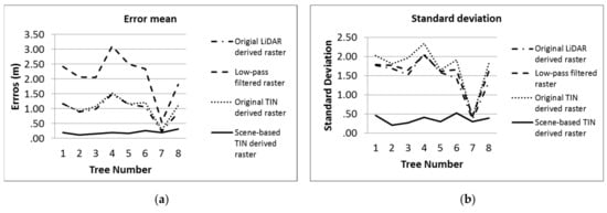 The average errors and standard deviations of the eight different trees were also calculated from the rasterized images and LiDAR points (Table 2). With Original Raster images, the lowest error is 0.23 m for Pine 1 and the highest error is 1.49 m for Maple 1. Ori-TIN derived raster resulted in similar errors, ranging from 0.29 to 1.53 m, with a standard deviation from 0.43 to 2.33. Different from low-pass filtered raster which increased the average error of Pine 1 to 0.55 m and Maple 1 to 3.11 m, Scene-based-TIN-derived raster images reduced the average error of eight trees to 0.18 m, with an average standard deviation of 0.37 (Figure 11). Especially, the average estimation error for the six deciduous trees is 0.15 m with a standard deviation of 0.37, while the error mean for the two pines is 0.25 with a standard deviation of 0.35.