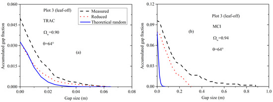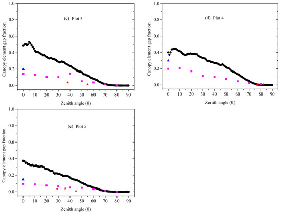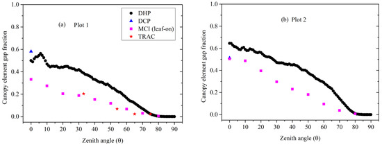 The or of TRAC tended to be smaller than those of MCI, DHP, and DCP (Figure 1 and Figure 2). This finding is consistent with the finding of Raabe et al. [64], Leblanc et al. [32], Pisek et al. [33], and Ryu et al. [35]. This can be attributed to the limitation of TRAC sensor resolution as the small within canopy gaps were underestimated by TRAC [64]. For TRAC, a problem occurred when the LAI-2200 or Miller inversion model was adopted by TRAC in the ESU LAI estimation because only one or and or estimate can be obtained from each TRAC measurement. In practice, the TRAC measurement datasets of each plot with the same zenith angle range covered by LAI-2200 or Miller are difficult to gather, especially for plots in high latitude areas where the solar zenith angles of daytime are usually small. An alternative option for TRAC to be adopted as the routine method in the LAI estimation is to derive the LAI with the combination of TRAC and Beer. Similar estimates were obtained from MCI and TRAC (0.90 and 0.94) at a zenith angle of 64° in the leaf-off plot 3, indicating that TRAC remains effective in deriving at this zenith angle (Figure 8). However, Law et al. [65] suggested avoiding taking TRAC measurements at zenith angles larger than 60° due to the difficulty of TRAC to distinguish small gaps at these zenith angles. An error estimate of 0.75 was derived at zenith angle of 75° for TRAC in the leaf-on plot 5 as all the photosynthetic photon flux density values of this TRAC measurement was equal to zero µmol m−2 s−1 (not shown in Figure 4). Therefore, caution is needed for TRAC to derive the or and LAI of L. principis-rupprechtii forests at zenith angles larger than 70°.