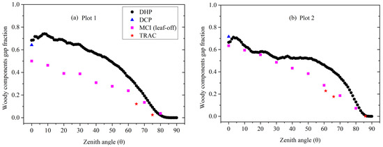Woody components gap fraction () measurements obtained from DHP, TRAC, MCI, and DCP in the five leaf-off plots: (a) plot 1, (b) plot 2, (c) plot 3, (d) plot 4, and (e) plot 5.